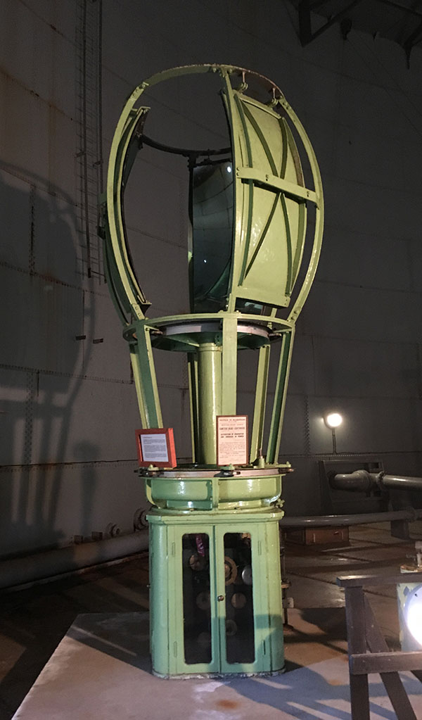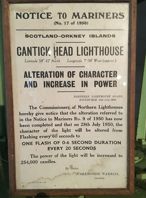 This very rare item is the original optical apparatus from the Cantick Head lighthouse and is to be found in the Scapa Flow Museum on Hoy at Lyness. It is comprised of three parabolic mirror reflectors mounted on a mechanism that is rotated by the clockwork engine below. As far as is known there is only one other such apparatus in existence and is to be found at the National Lighthouse Museum at Fraserburgh, Scotland. A pressurised paraffin light was originally mounted inside at the focal point of the device. It was not replaced until 1950 (below). [Photo: Ken Trethewey (2016)]